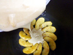 | (2) | 熱したフライパンでバターを溶かし、1のリンゴと砂糖を入れ炒めるようにソテーします。 | ![]() |
